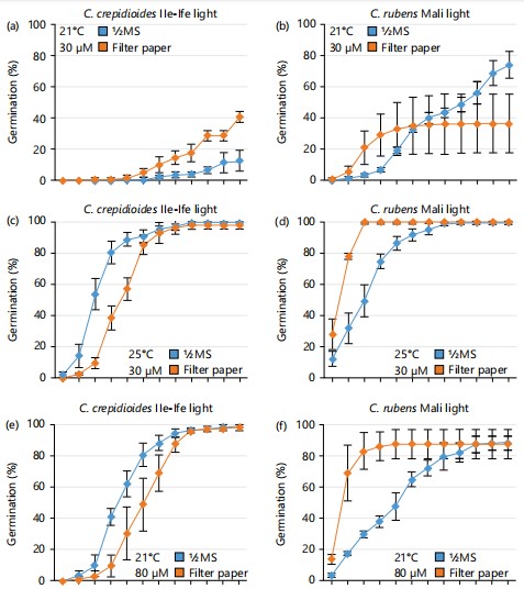 Germination of C. crepidioides and C. rubens seeds on filter paper and ½MS medium at different temperatures (21 and 25°C) and light intensities (30 and 80 μmol m-2s-1).