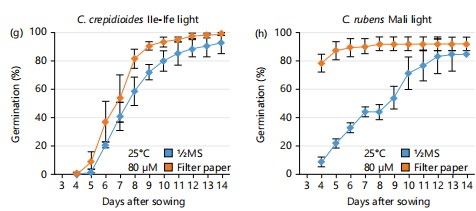At higher light intensity of 80 μmol m-2s-1 or higher temperature of 25°C, the seeds were relieved of the observed dormancy (Fig. 3c-h). Interestingly, C. crepidioides seeds from plants grown in winter showed a higher germination capacity at higher temperatures and light levels than those from summer grown plants (Fig. 3d-f and h). In contrast, C. rubens seeds from mother plants grown in summer generally exhibited better germination than those from winter-grown plants. These findings are consistent regardless of the germination environment.