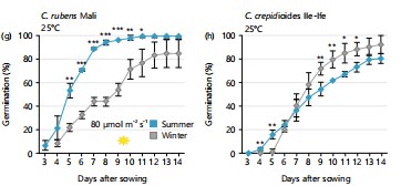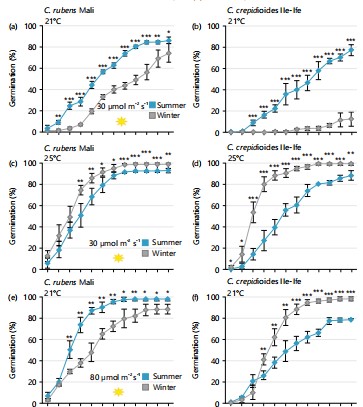 Germinating the seeds at a light intensity of 30 μmol m-2s-1 and at 21°C, both C. rubens and C. crepidioides seeds from mother plants grown in winter were more dormant than those from mother plants grown in summer (Fig. 3a-b). This was evident with the reduced germination capacity recorded from the seeds harvested in winter. Notably, the germination capacity of C. crepidioides seeds obtained during winter was considerably lower, with approximately 10% germination recorded 14 DAS (Fig. 3b).