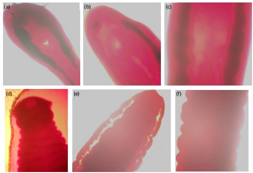 Identified helminth parasite species: Three helminth parasite taxa were identified: Trematodes Clinostomum spp. (Fig. 3a-b) from gills, and Euclinostomum sp. (Fig. 3c) from intestines, Cestode; Polyonchobothrium polyepiteri (Fig. 3d-f) from intestines. Trematodes were the most abundant group, accounting for 308 (84.8%) of the total parasites recovered, while cestodes accounted for 55 (15.2%). Among the species, immature trematodes in the gastrointestinal tract (GIT) were the most prevalent (228, 62.8%), followed by Clinostomum spp., in the gills (72, 19.8%) (Table 2).