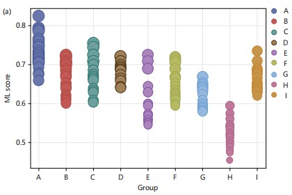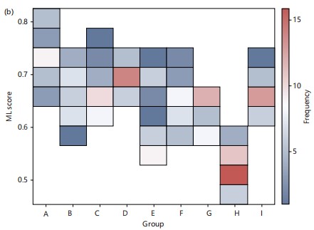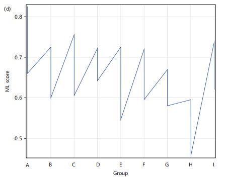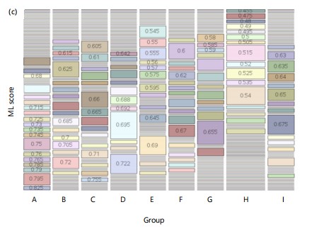 Figure 2a presents a bubble plot showing the variation in ML (machine learning) scores for IL-2- inducing peptides, where larger bubbles denote higher predictive strength. Figure 2b displays a heatmap highlighting the intensity of ML scores across different protein groups, with warmer colors indicating stronger IL-2-induction potential. Figure 2c shows a mosaic plot representing the relative frequency distribution of scores among the nine protein groups (A-I), demonstrating the variability in IL-2-inducing ability. Figure 2d presents a series plot summarizing the ML score trend across the groups, where Group A recorded the highest mean score, followed by Groups B and C, while Group H exhibited the lowest. These visualizations collectively depict that all selected hypothetical proteins possess IL-2-inducing potential, although the magnitude of induction varies significantly among the groups.