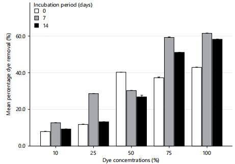 | The highest and lowest biomass weights were 28.5 g (at 50% dye concentration on day 7) and 21.0 g (at 75% dye concentration on day 14) | ||||