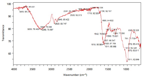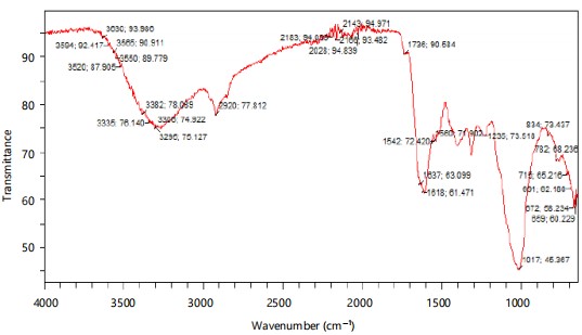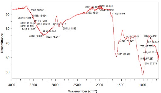 Fourier-Transform Infrared Spectroscopy (FTIR) analysis (Fig. 2-8) revealed distinct chemical transformations in the RY176 dye after 14 days of exposure to Lemna species. The initial dye spectrum (Fig. 2) showed strong peaks characteristic of hydroxyl (-OH), carboxyl (-COOH), azo (-N = N-), nitro (-NO2), sulfonic acid (-SO3H) and chloro (C-Cl) functional groups, indicative of a complex aromatic structure. Post-treatment spectra (Fig. 3-8) demonstrated a notable decrease in intensity or disappearance of peaks associated with the azo (~1600-1500 cm–1) and nitro groups (~1510, 1343 cm–1).