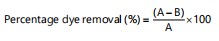Dye concentration was measured spectrophotometrically at a maximum absorption wavelength (λmax = 419 nm). Dye percentage removal efficiency (%) was calculated using the formula1:
