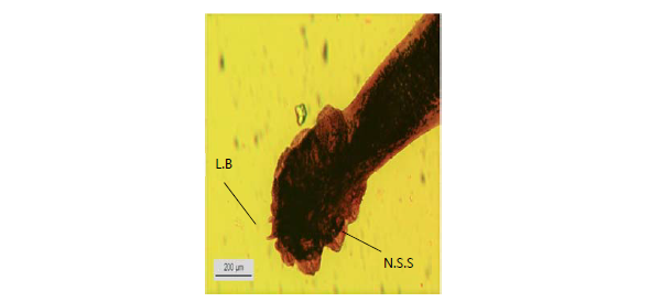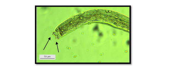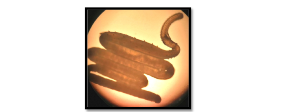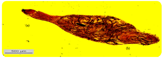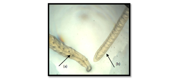 During this study, no cestode infections were detected in Sarpa salpa. However, nematode infections were observed in the digestive tract at a prevalence rate of 30%. These helminths belong to the phylum Nemathelminthes and the class Nematoda (Fig. 12-14). The nematodes were slender, with anterior lip-like structures, and were primarily found in their larval stages. They exhibited an irregular, coiled body wall and a simple oesophagus. Based on morphological characteristics, these worms were identified as belonging to the order Rhabditida25.