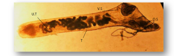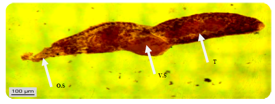 In this study, the digenean parasite isolated from the digestive tract exhibited distinct morphological features. The anterior end of the worm is tapered and bears a small oral sucker, while a larger ventral sucker is located mid-body. A follicular sac is positioned above the ventral sucker, and the testes are spherical and situated at the posterior end of the body. Based on these characteristics, the parasite is classified within the order Plagiorchiida24, as illustrated in Fig. 11.