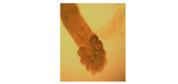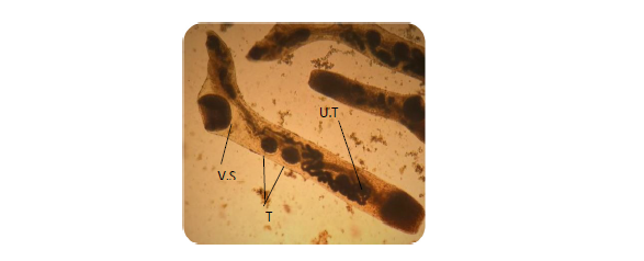 Regarding the Digenea collected from the gills and digestive tract, these helminths are hermaphroditic with complex life cycles. Most are parasitic in the internal organs of marine fish, while some infect the gills. They feed on the connective tissues of the gills and can be pathogenic to fish18. The morphological features of this digenean include a small oral sucker, a larger ventral sucker, and spherical testicles located above the egg-filled uterus, classifying them under the order19 Azygiida as shown in Fig. 5.