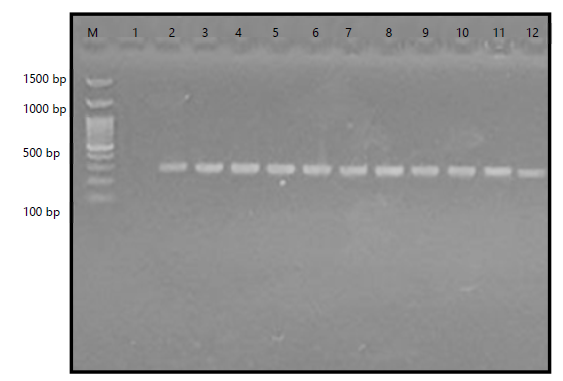 The gel electrophoresis results revealed distinct bands at 310 bp, confirming the presence of the mecA gene. A DNA ladder was used to estimate fragment sizes, ensuring accurate band identification. Positive samples displayed clear amplification, while negative controls showed no visible bands. Variations in band intensity were observed among samples, indicating differences in DNA concentration or amplification efficiency. No signs of contamination or non-specific amplification were detected. The separation of DNA fragments occurred as expected, with well-defined bands corresponding to the target mecA gene Fig. 2.